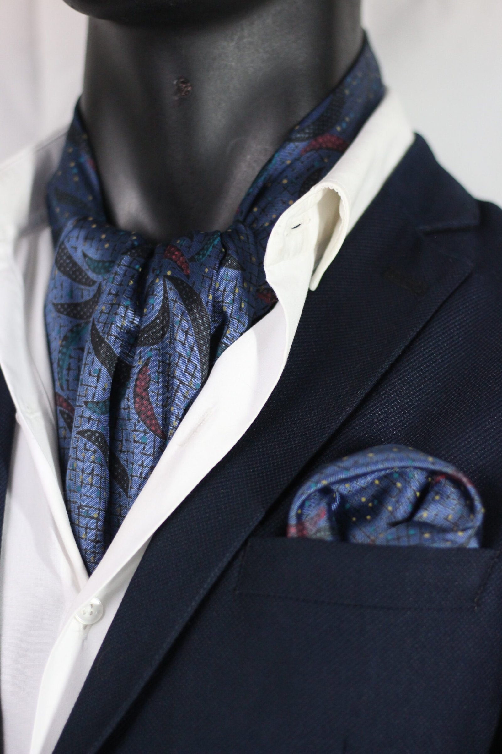 ascot with your look. So, with a patterned cravat like this one it’s a good idea to wear a solid shirt or a small patterned shirt, with a solid jacket to create a